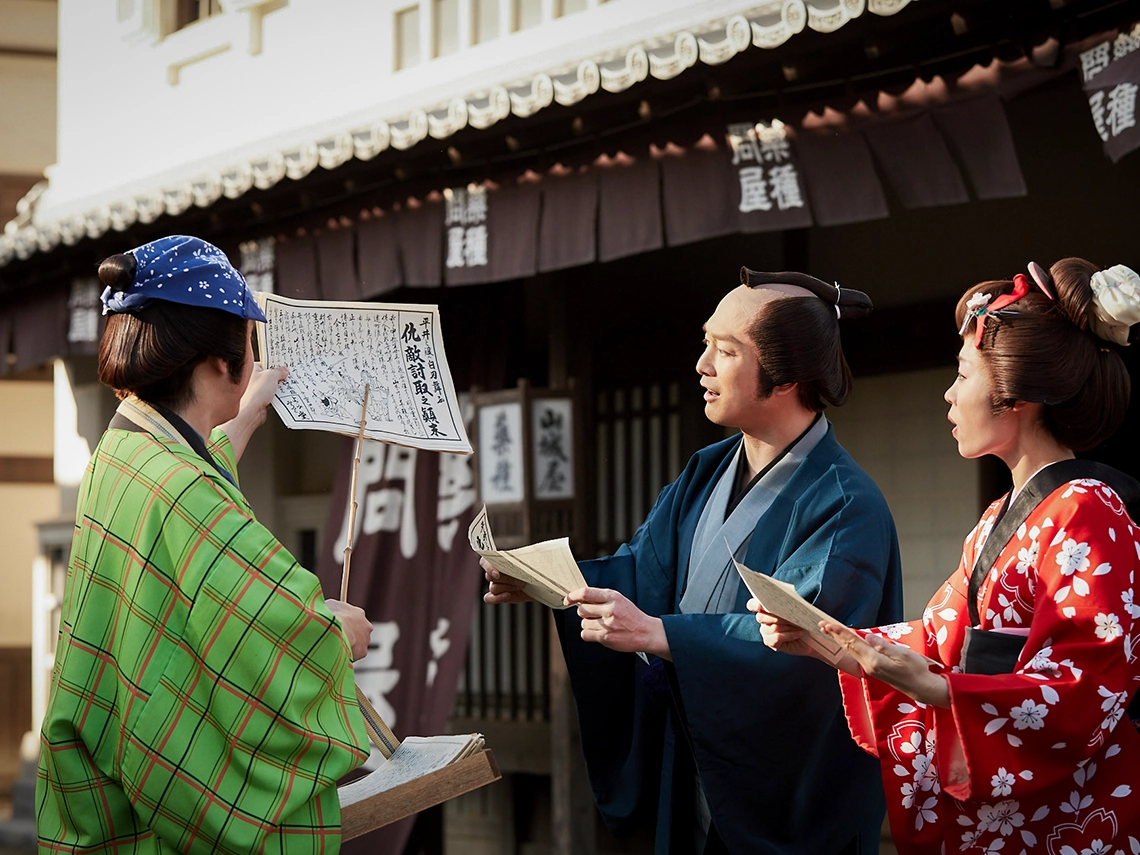 The highlights are undoubtedly the spectacular acting and powerful sword fighting by the actors from Uzumasa! In addition, young, up-and-coming actors selected through auditions will give realistic and passionate performances as the lively residents of Edo, even recreating the town's atmosphere. Become one of the residents of Edo and enjoy the special time that leads up to the climax of the main show!
